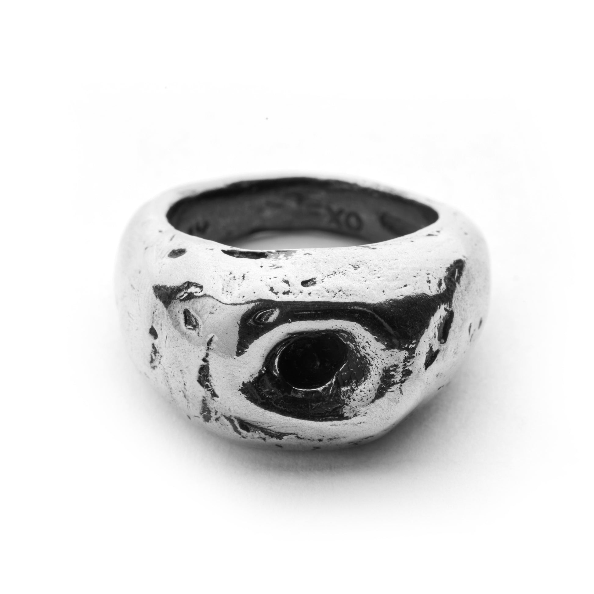 Cast in recycled bronze plated micron silver, hand carved/lost wax technique, antiqued molten band. The ABYSS ring embodies a hollow center, symbolizing the boundless essence of the cosmos. A constant reminder of the immeasurable, indefinable, and incomprehensible abundance of the universe.
