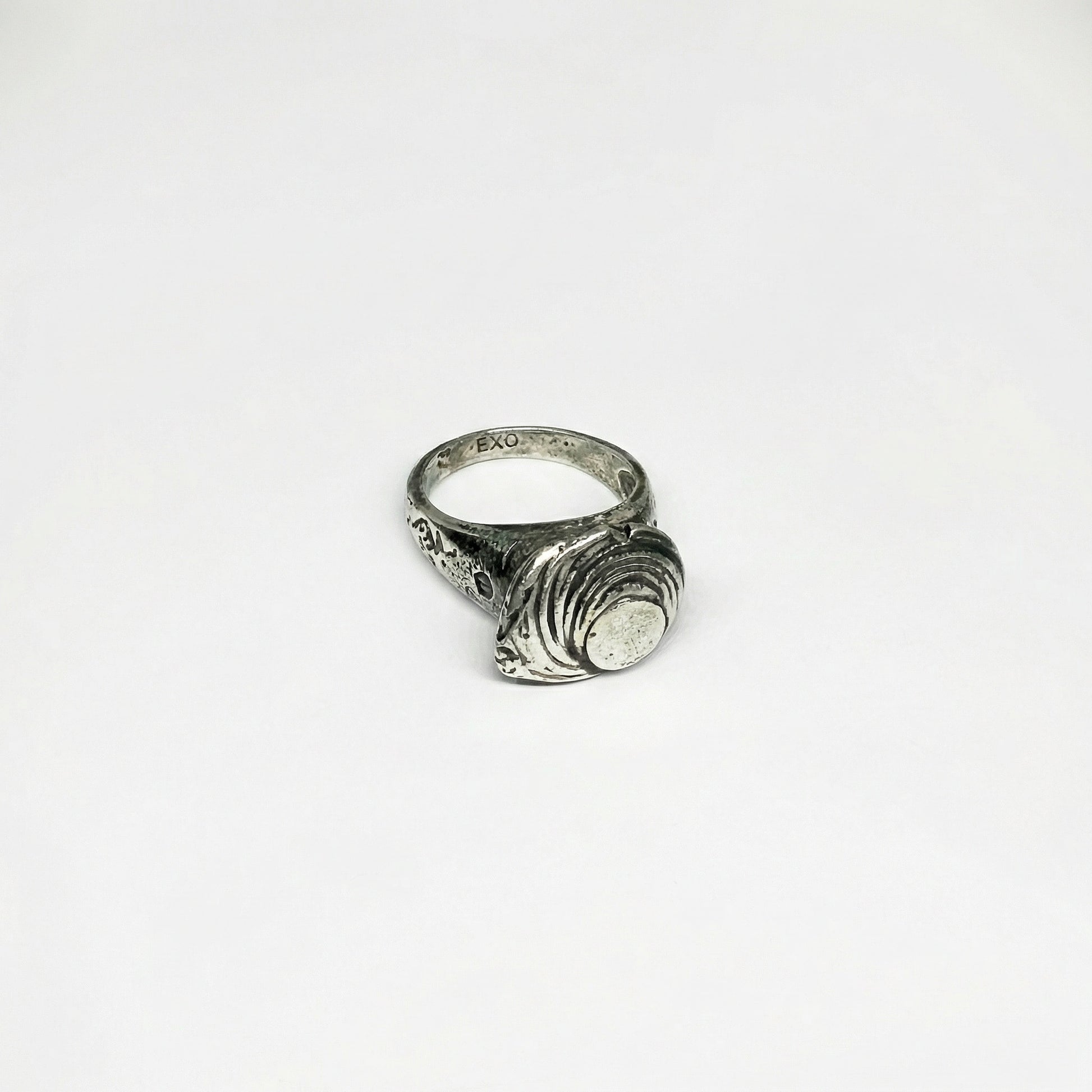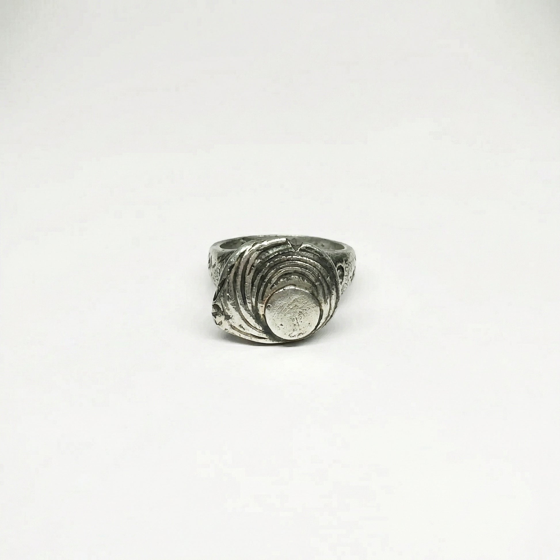 Cast in recycled bronze plated micron silver, hand carved/lost wax technique, antiqued ring. Arcanus—meaning mystery and secrets in ancient Latin. This ring honors your unique spiritual essence, much like your one-of-a-kind fingerprint, connecting you to deeper truths and inner wisdom.