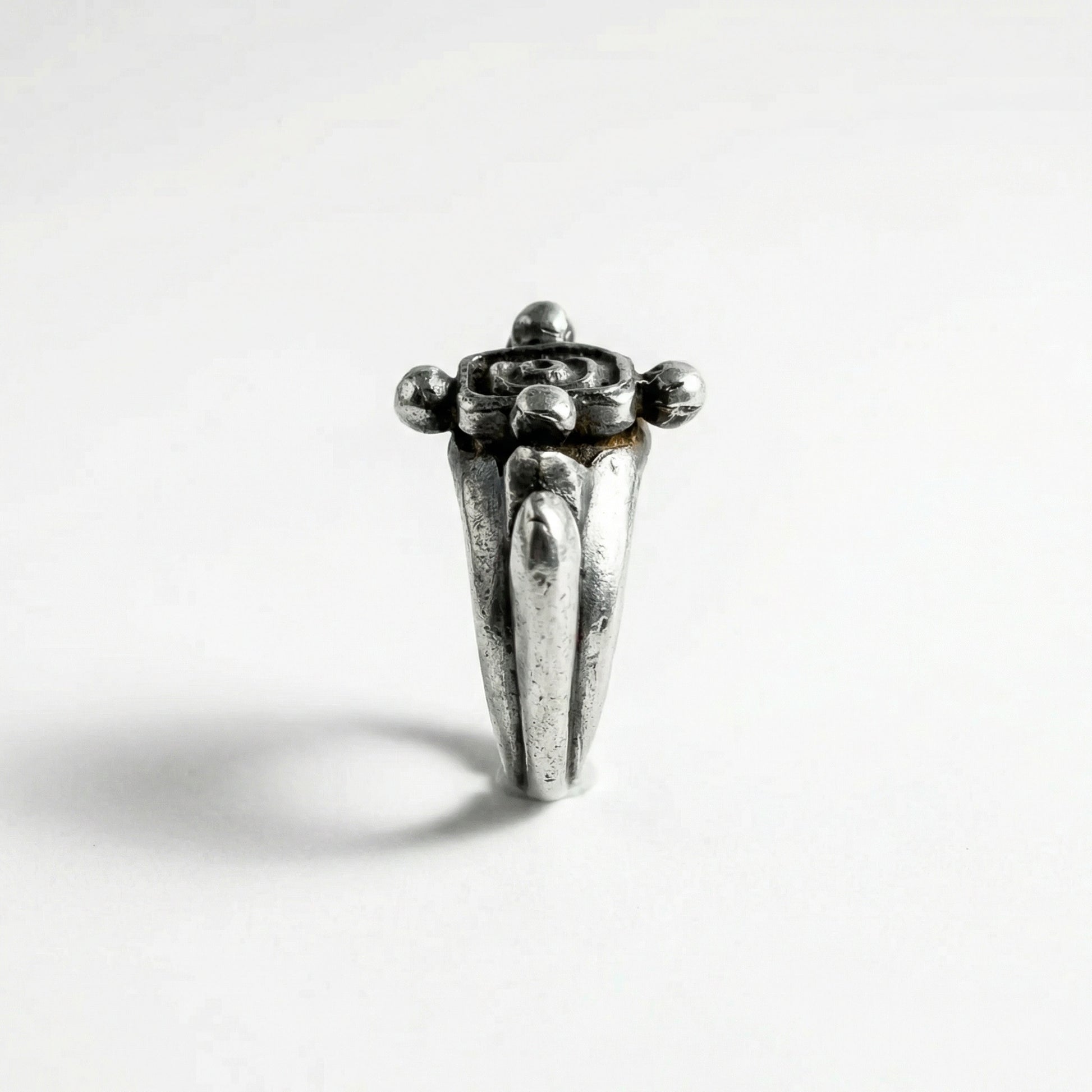 Cast in recycled bronze plated micron silver, hand carved/lost wax technique, antiqued ring. The Ariadne Ring channels the sacred geometry of the cardinal directions and four elemental forces. Named after the mythological guide who illuminated the path through darkness, this piece embodies spiritual navigation and cosmic balance. Each direction—north, south, east, and west—represents a fundamental element: earth, fire, water, and air. This ring was created intending to connect the wearer with these universal energies, grounding while opening pathways to inner wisdom.
