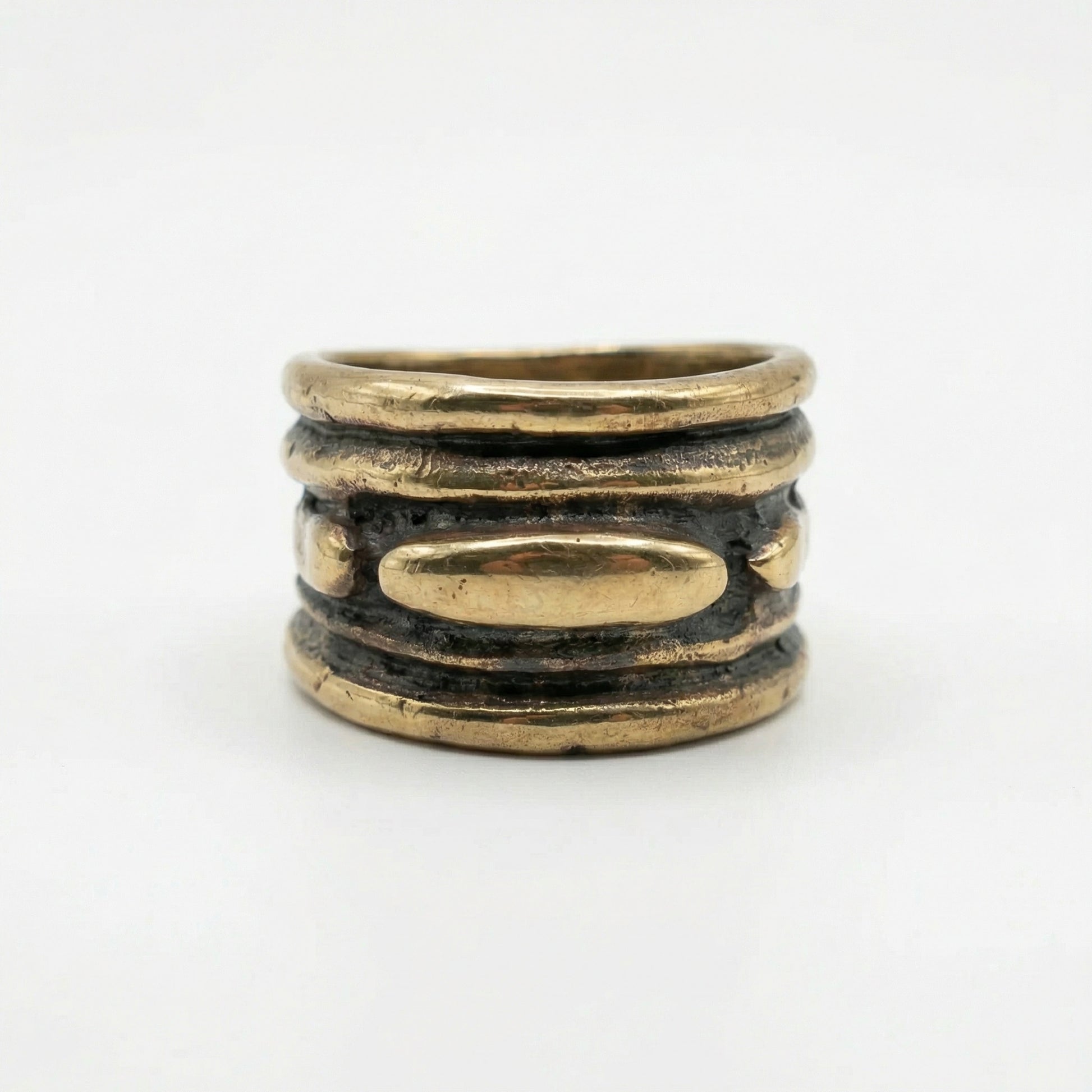 Cast in recycled bronze , hand carved/lost wax technique, antiqued molten band ring.