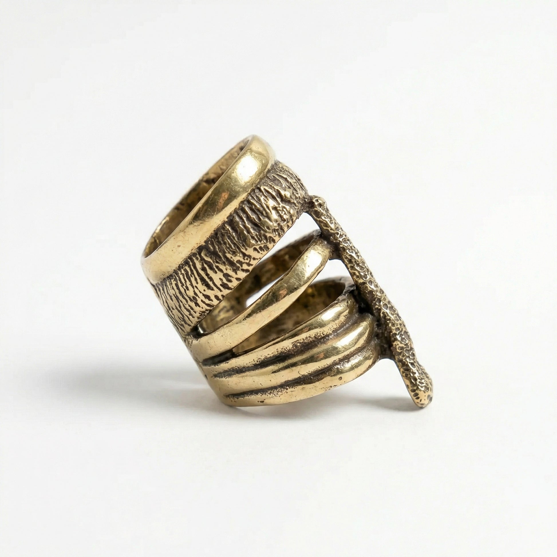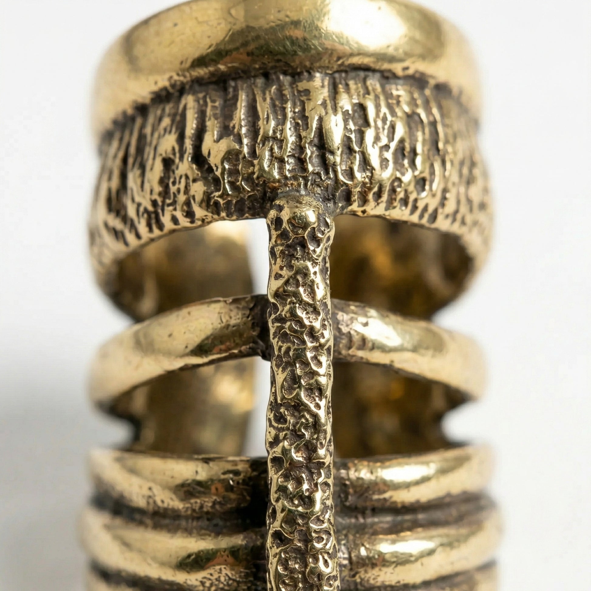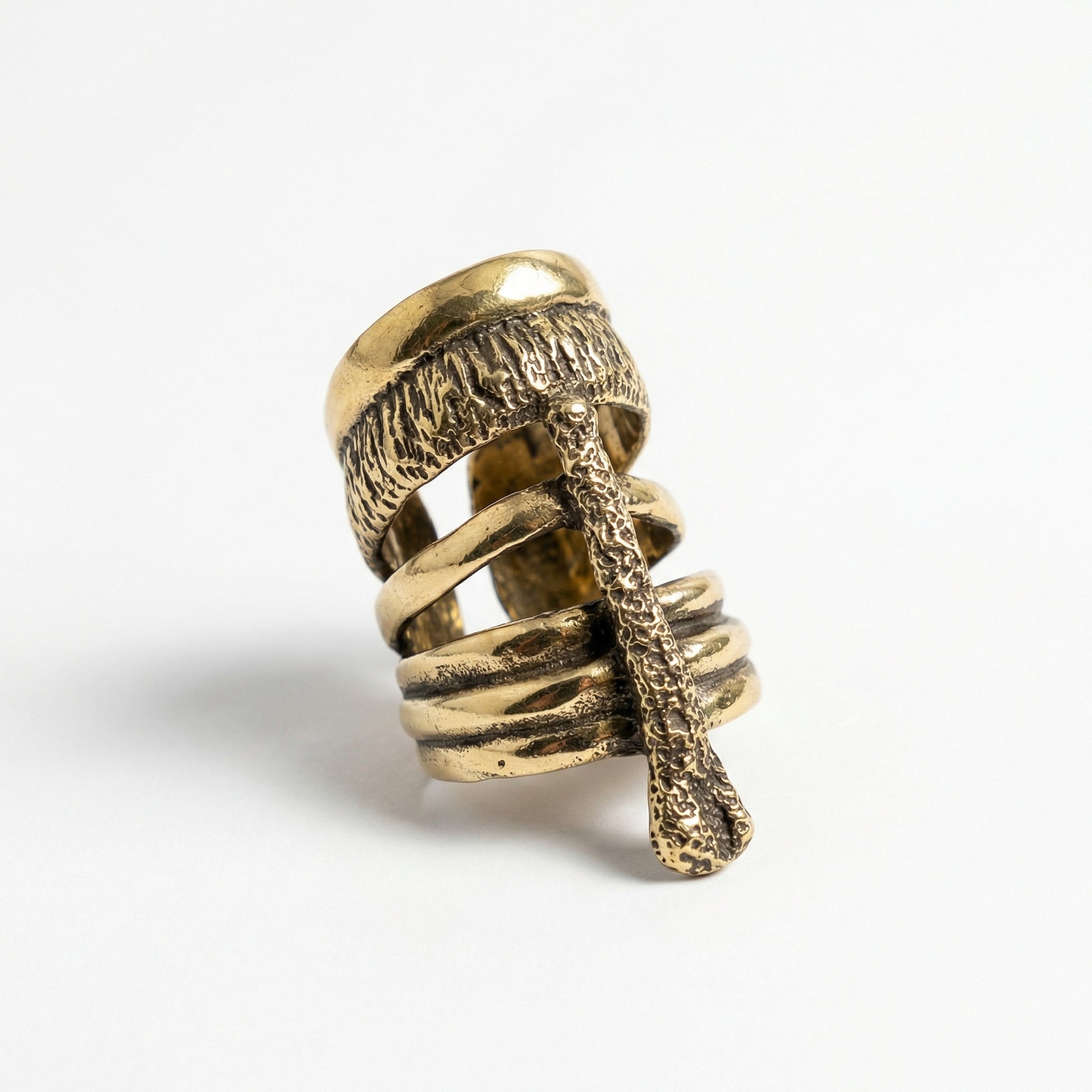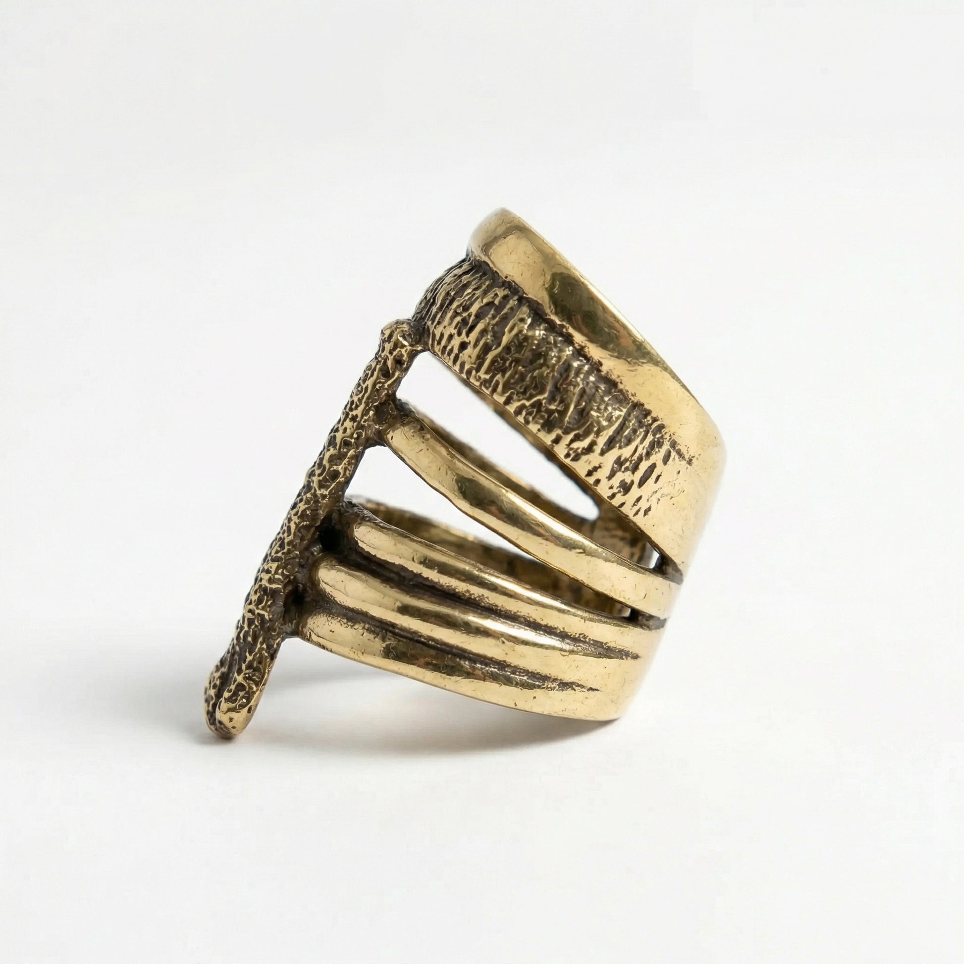 Geri dönüştürülmüş bronzdan dökülmüş, el oyması/kayıp mum tekniğiyle yapılmış, eskitilmiş görünümlü yüzük.