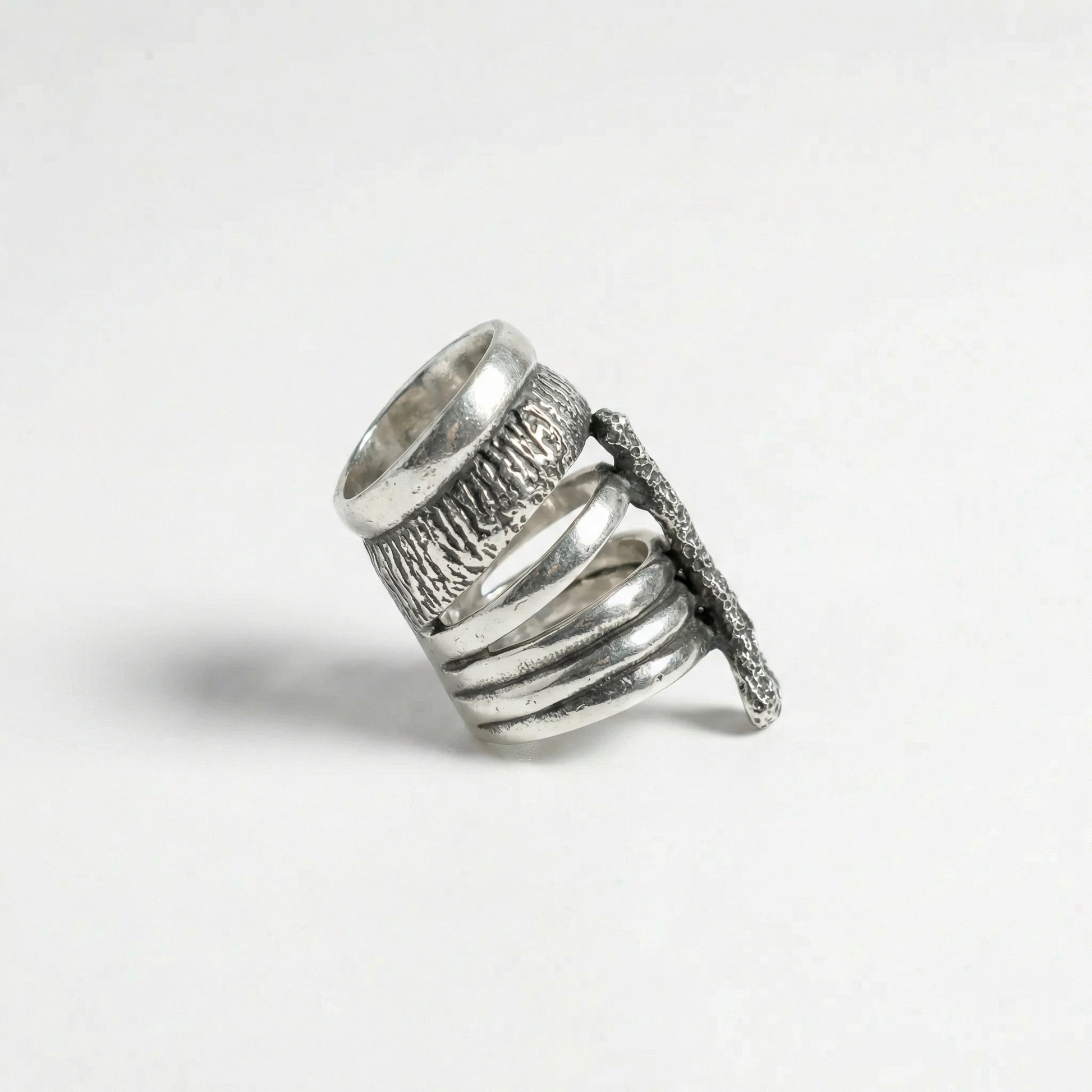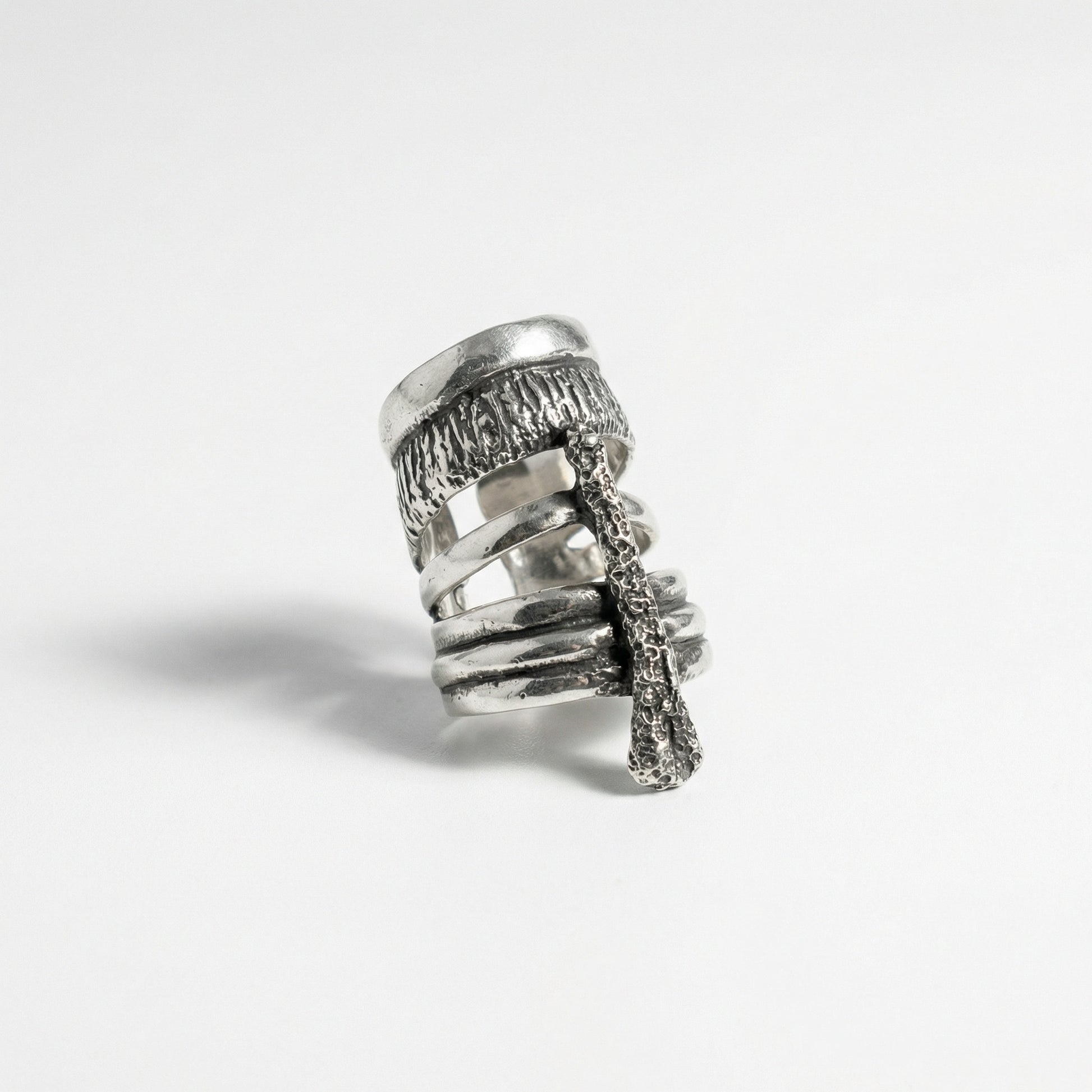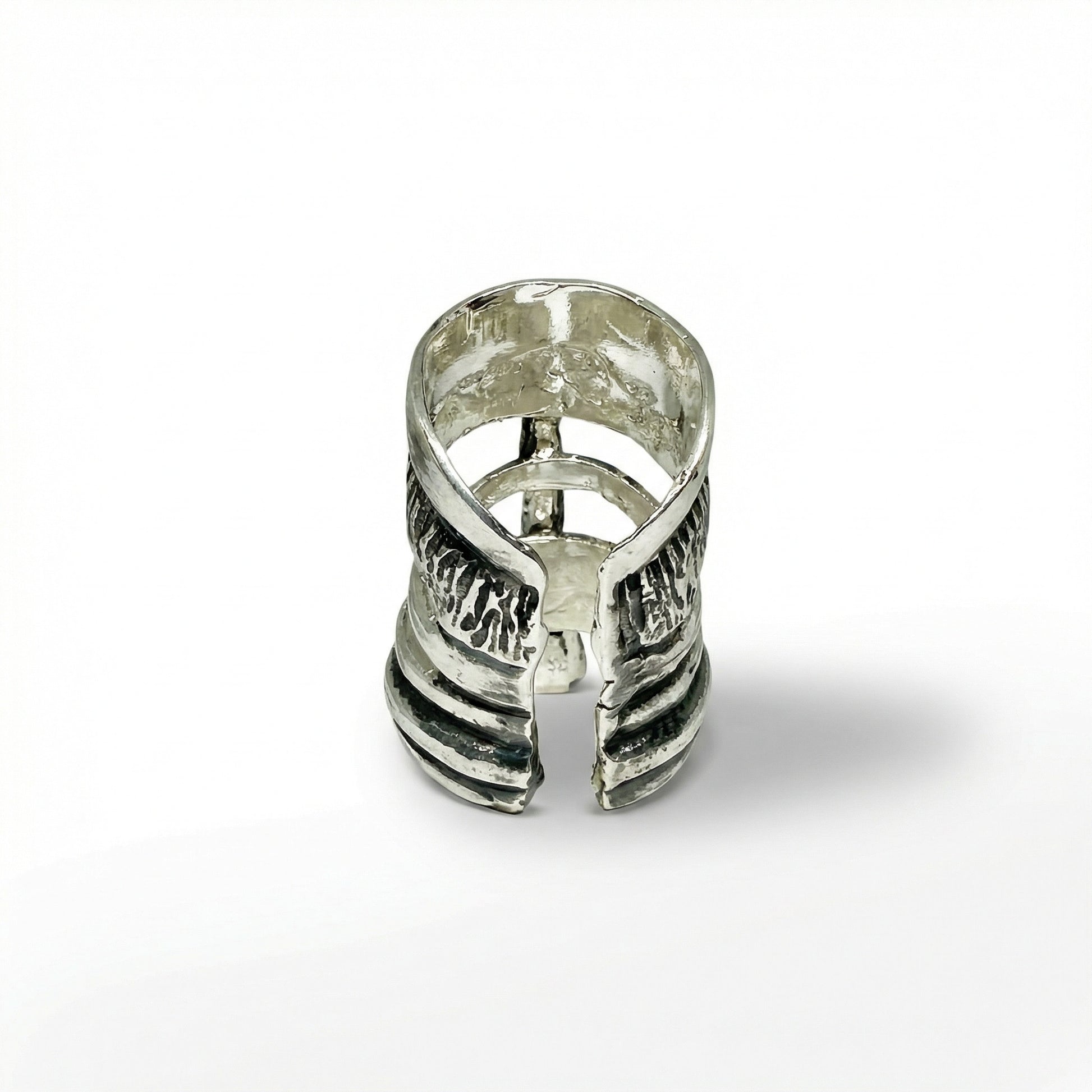 Geri dönüştürülmüş bronzdan dökülmüş, mikron gümüş kaplama, el oyması/kayıp mum tekniğiyle yapılmış, eskitilmiş yüzük. Regalia, egemenliğin ve ruhani otoritenin kutsal sembolünü temsil eder. Bu yüzük, ilahi güçle bağlantınızı uyandırır ve içsel ihtişamınızın ve göksel çağrınızın somut bir sembolü olarak hizmet eder.